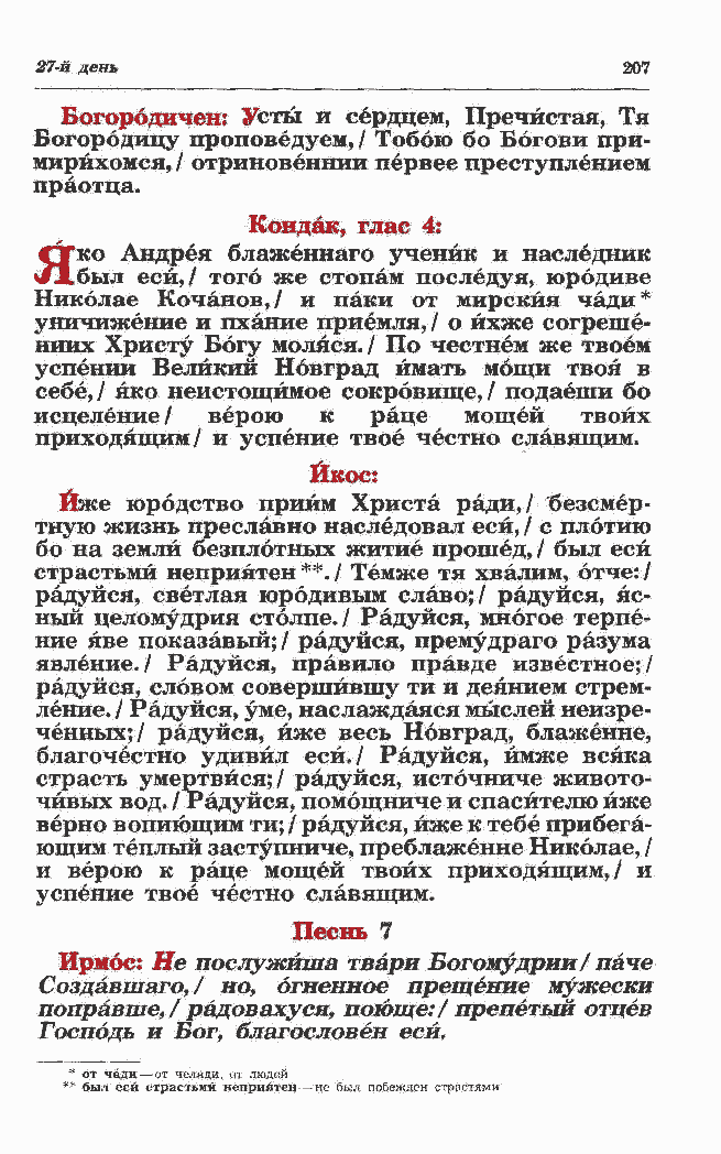 тную жизнь преславно наследовал еси,/ с плотию бо на земли безплотных житие прошед,/ был еси страстьмй неприятен**./ Темже тя хвалим, отче:/ радуйся, светлая юродивым славо;/ радуйся, яс- ный целомудрия столпе./ Радуйся, многое терпе- ние яве показавый; / радуйся, премудраго разума явление./ Радуйся, правило правде известное;/ радуйся, словом совершйвшу ти и деянием стрем- ление. / Радуйся, уме, наслаждался мыслей неизре- ченных;/ радуйся, йже весь Новград, блаженне, благочестно удивил еси./ Радуйся, ймже всяка страсть умертвйся;/ радуйся, источниче живото- чивых вод. /Радуйся, помощниче и спасителю йже верно вопиющим ти; / радуйся, йже к тебе прибега- ющим теплый заступниче, преблаженне Николае, / и верою к раце мощей твоих приходящим,/ и успение твое честно славящим. Песнь 7