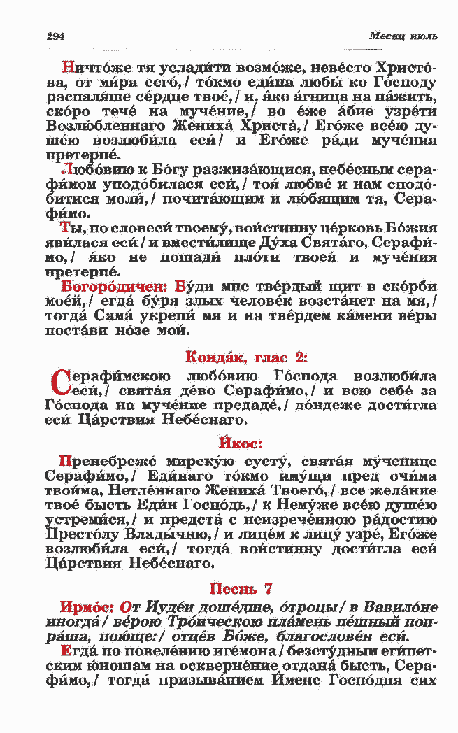 Серафиме,/ Едйнаго токмо имущи пред очйма твойма, Нетленнаго Жениха Твоего, / все желание твое бысть Един Господь, / к Немуже всею душею устремйся,/ и предста с неизреченною радостию Престолу Владычню, / и лицем к лицу узре, Егоже возлюбила еси,/ тогда войстинну достигла еси Царствия Небеснаго. Песнь 7