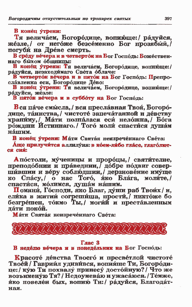 дице, таинства, / чистоте запечатанной и девству хранйму,/ Мати позналася еси неложна,/ Бога рождши Йстиннаго./ Того моли спастйся душам нашим. В конец утрени: Мати Святая неизреченнаго Света: