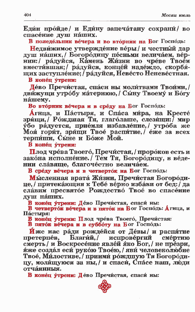 це, / притекающия к Тебе верно избави от бед: / да славим пресвятое Рождество Твое во спасение душ наших. В конец утрени: Дево Пречистая, спаси ны: В четверток вечера и в пяток на Бог Господь: Агнца, и Пастыря: В конец утрени: Плод чрева Твоего, Пречистая: В пяток вечера и в субботу на Бог Господь: Йже нас ради рождейся от Девы/ и распятие