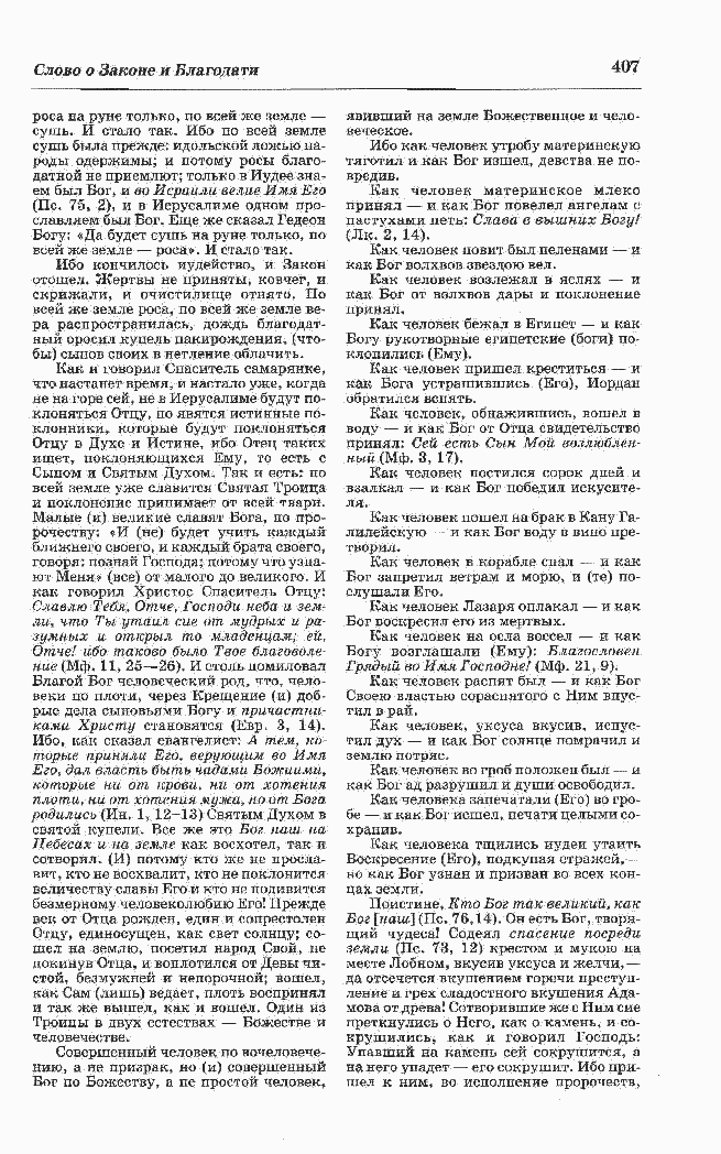 что настанет время, и настало уже, когда не на горе сей, не в Иерусалиме будут по- клоняться Отцу, но явятся истинные по- клонники, которые будут поклоняться Отцу в Духе и Истине, ибо Отец таких ищет, поклоняющихся Ему, то есть с Сыном и Святым Духом. Так и есть: по всей земле уже славится Святая Троица и поклонение принимает от всей твари. Малые (и) великие славят Бога, по про- рочеству: «И (не) будет учить каждый ближнего своего, и каждый брата своего, говоря: познай Господа; потому что узна- ют Меня» (все) от малого до великого. И как говорил Христос Спаситель Отцу: Славлю Тебя, Отче, Господи неба и зем- ли, что Ты утаил сие от мудрых и ра- зумных и открыл то младенцам; ей, Отче! ибо таково было Твое благоволе- ние (Мф. 11, 25?26). И столь помиловал Благой Бог человеческий род, что, чело- веки по плоти, через Крещение (и) доб- рые дела сыновьями Богу и причастни- ками Христу становятся (Евр. 3, 14). Ибо, как сказал евангелист: А тем, ко- торые приняли Его, верующим во Имя Его, дал власть быть чадами Божиими, которые ни от крови, ни от хотения плоти, ни от хотения мужа, но от Бога родились (Ин. 1, 12-13) Святым Духом в святой купели. Все же это Бог наш на Небесах и на земле как восхотел, так и сотворил. (И) потому кто же не просла- вит, кто не восхвалит, кто не поклонится величеству славы Его и кто не подивится безмерному человеколюбию Его! Прежде век от Отца рожден, един и сопрестолен Отцу, единосущен, как свет солнцу; со- шел на землю, посетил народ Свой, не покинув Отца, и воплотился от Девы чи- стой, безмужней и непорочной; вошел, как Сам (лишь) ведает, плоть воспринял и так же вышел, как и вошел. Один из Троицы в двух естествах ? Божестве и человечестве. Совершенный человек по вочеловече-