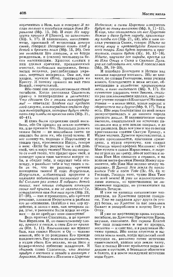бели, ибо Он пришел на землю посетить их, и не приняли Его, Поскольку дела их темны были ? не возлюбили света: не явились бы дела их, ибо (они) темны. И вот потому-то, подходя к Иерусалиму и увидев град, прослезился Иисус, говоря о нем: «Если бы разумел ты в сей день свой, что к миру твоему! Ныне же сокры- то от очей твоих, что придет срок твой, и возведут враги твои частокол вокруг те- бя, и обидят тебя, и окружат тебя ото- всюду, и разобьют тебя и чад твоих в те- бе за то, что не разумел времени посещения твоего! И еще: Иерусалим, Иерусалим, избивающий пророков и камнями побивающий посланных к те- бе! Сколько раз хотел Я собрать детей твоих, как птица собирает птенцов своих под крылья, и вы не захотели! Се, оставляется вам дом ваш пуст (Мф. 23, 37-38), ? как и произошло, ибо пришли римляне, пленили Иерусалим и разбили его до основания. Погибло с тех пор иу- действо, и закон с ним, как вечерняя за- ря, угас, и рассеяны были иудеи по стра- нам ? да не пребудет злое совокупно! Ведь пришел Спаситель, и не принят