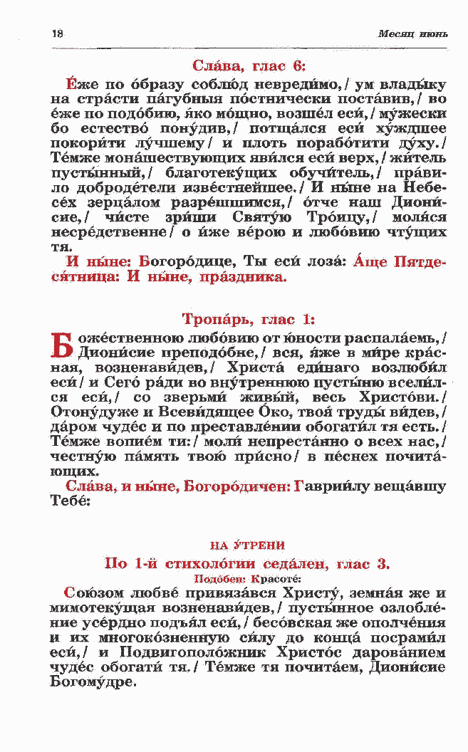 на страсти пагубныя постнически поставив,/ во еже по подобию, яко мощно, возшел еси, / мужески бо естество понудив,/ потщался еси хуждшее покорйти лучшему/ и плоть поработити духу./ Темже монашествующих явился еси верх, / житель пустынный,/ благотекущих обучйтель,/ прави- ло добродетели известнейшее. / И ныне на Небе- сех зерцалом разрешшимся, / отче наш Дионй- сие,/ чйсте зрйши Святую Троицу,/ моляся несредственне / о иже верою и любовию чтущих тя. И ныне: Богородице, Ты еси лоза: Аще Пятде-