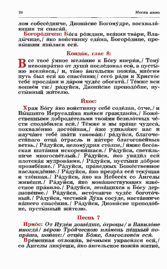 Вышняго Иерусалима явйвся гражданин,/ Боже- ственными добродетельми твоими безплотных че- сти сподобился еси./ Темже и мы зряще чудеса, похвалению достойная,/ яже удивляют нас и научают тебе звати таковая:/ радуйся, благоче- стйваго отца отрасль и матере благоговейный ветвь. / Радуйся, целомудрия столпе, / ймже бесов- ская шатания искоренйшася. / Радуйся, светйль- ниче многосветлый./ Радуйся, яко увядйл еси плотская мудрования./ Радуйся, пустыни доброе прозябение./ Радуйся, праведных Божественное наслаждение. / Радуйся, яко презрел еси текущая и тленная./ Радуйся, яко на Небесех со Ангелы живеши./ Радуйся, яко монашествующих изве- стное правило./ Радуйся, ленящихся к Богу дер- зновение./ Радуйся, источниче чудес боготоч- ный./ Радуйся, честный Духа сосуде, наставниче нашего спасения./ Радуйся, Дионйсие преподоб- ие, пустынный жителю. Песнь 7