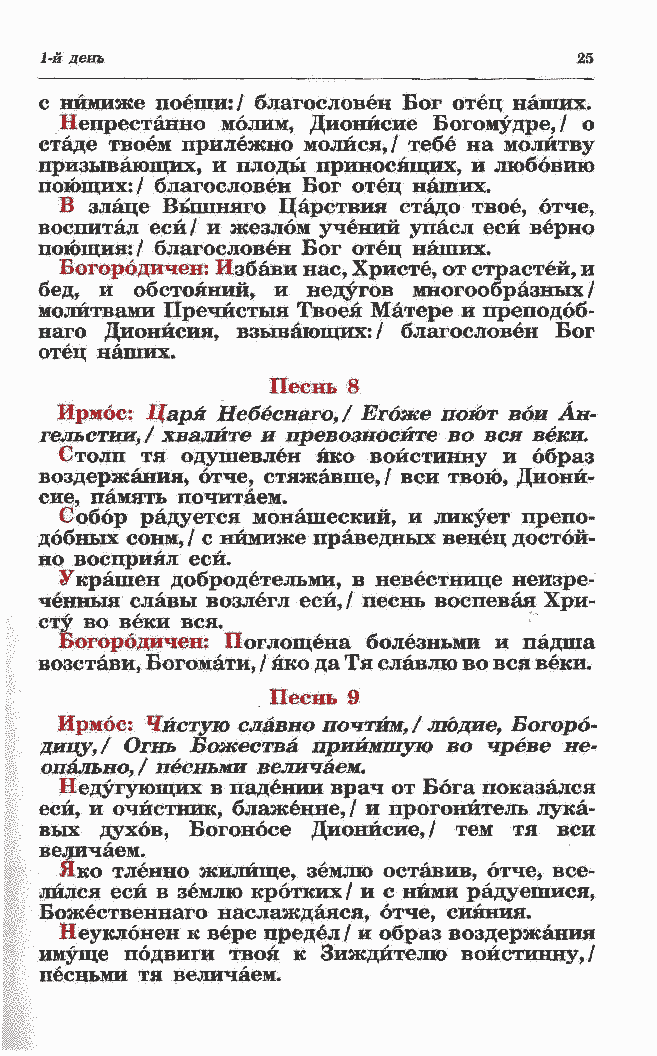 бед, и обстояний, и недугов многообразных/ молитвами Пречйстыя Твоей Матере и преподоб- наго Дионисия, взывающих:/ благословен Бог отец наших. Песнь 8