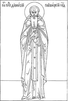 добродетелей достиг л еси крайнее / жития воздер- жанием, / из пустыни смотряя Вышняго Иерусали- ма красоты/ и болезненных подвигов достойно почести восприйм, / с Небесными радуешися чино- началии, преблаженне, / вечных благ наследник явился еси,/ Небеснаго Царствия житель быв./ Молися, Богонбсе Дионйсие, Спасу всех / умирйти мир и спасти души наша. И ныне: Владычице, прижми молитвы: