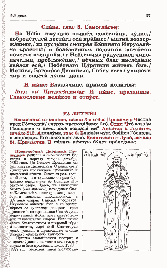 пред Господем/ смерть преподобных Его. Стих: Что воздам Господеви о всех, яже воздаде ми? Апостол к Галатом, зачало 213. Аллилуйя, глас 6: Блажен муж, бояйся Господа, в заповедех Его восхощет зело. Евангелие от Луки, зачало 24. Причастен: В память вечную будет праведник: Преподобный Дионисий Глу-