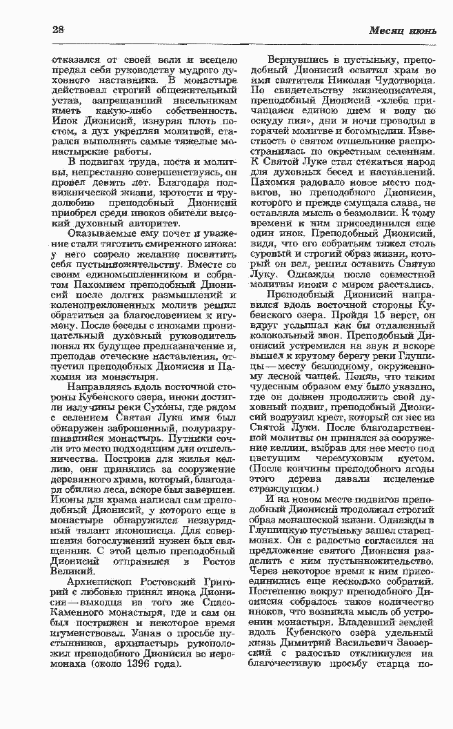роны Кубенского озера, иноки достиг- ли излучины реки Сухоны, где рядом с селением Святая Лука ими был обнаружен заброшенный, полуразру- шившийся монастырь. Путники соч- ли это место подходящим для отшель- ничества. Построив для жилья кел- лию, они принялись за сооружение деревянного храма, который, благода- ря обилию леса, вскоре был завершен. Иконы для храма написал сам препо- добный Дионисий, у которого еще в монастыре обнаружился незауряд- ный талант иконописца. Для совер- шения богослужений нужен был свя- щенник. С этой целью преподобный Дионисий отправился в Ростов Великий. Архиепископ Ростовский Григо-