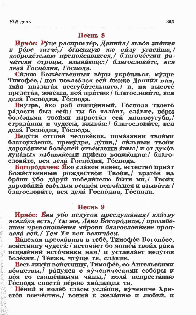 Тимофее,/ нов показался еси якоже Даниил нам, змия низлагая всегубйтельнаго, / и, на высоте представ, зовеши, поя присно: / благословите, вся дела Господня, Господа. Внутрь, яко раб священный, Господа твоего