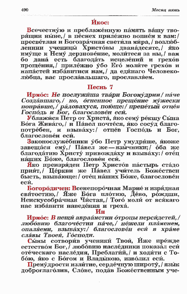 Создавшего,/ но, огненное прещение мужески поправше,/ радовахуся, поюще:/ препетый отцев Господь и Бог, благословен еси. Ублажйся Петр от Христа, яко сему рекшу Сына