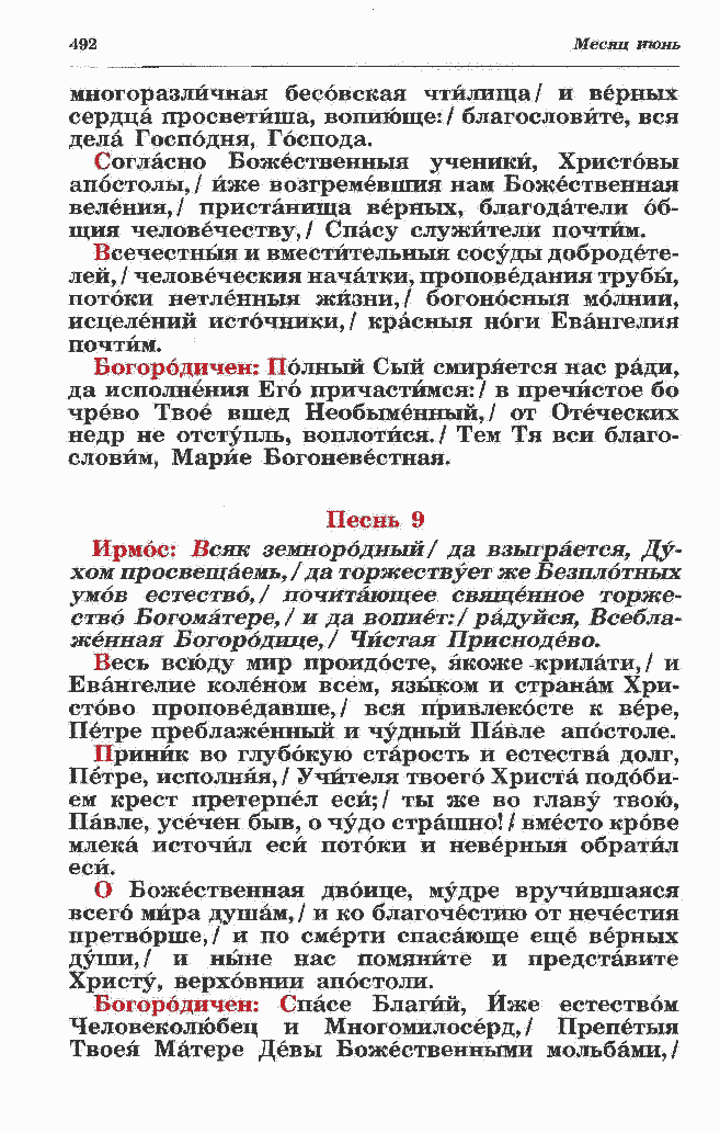 апостолы,/ йже возгремевшия нам Божественная веления,/ пристанища верных, благодетели 66- щия человечеству,/ Спасу служители почтим. Всечестныя и вместйтелъныя сосуды добродете-