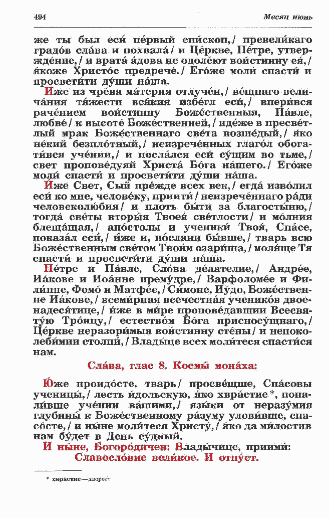 Иакове и Иоанне премудре, / Варфоломее и Фи- липпе, Фомо и Матфее, / Симоне, Иудо, Божествен- не Иакове, / всемирная всечестная учеников двое- надесятице, / йже в мире проповедавший Всесвя- тую Троицу,/ естеством Бога присносущнаго, / Церкве неразорймыя войстинну стены / и непоко- лебймии столпи, / Владыце всех молйтеся спастйся нам. Слава, глас 8. Космы монаха: