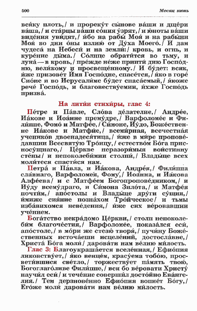 ваша, / и старцы в шли сбния узрят, / и юноты ваши видения увидят,/ ибо на рабы Моя и на рабыни Моя во дни оны излию от Духа Моего./ И дам чудеса на Небесй и на земли:/ кровь, и огнь, и курение дыма./ Солнце обратится во тьму, и луна?-в кровь,/ прежде неже прийти дню Господ- ню, великому и просвещенному./ И будет: всяк, йже призовет Имя Господне, спасется, / яко в горе Сионе и во Иерусалиме будет спасаемый,/ якоже рече Господь, и благовествуемии, йхже Господь призва. На литии стихиры, глас 4: