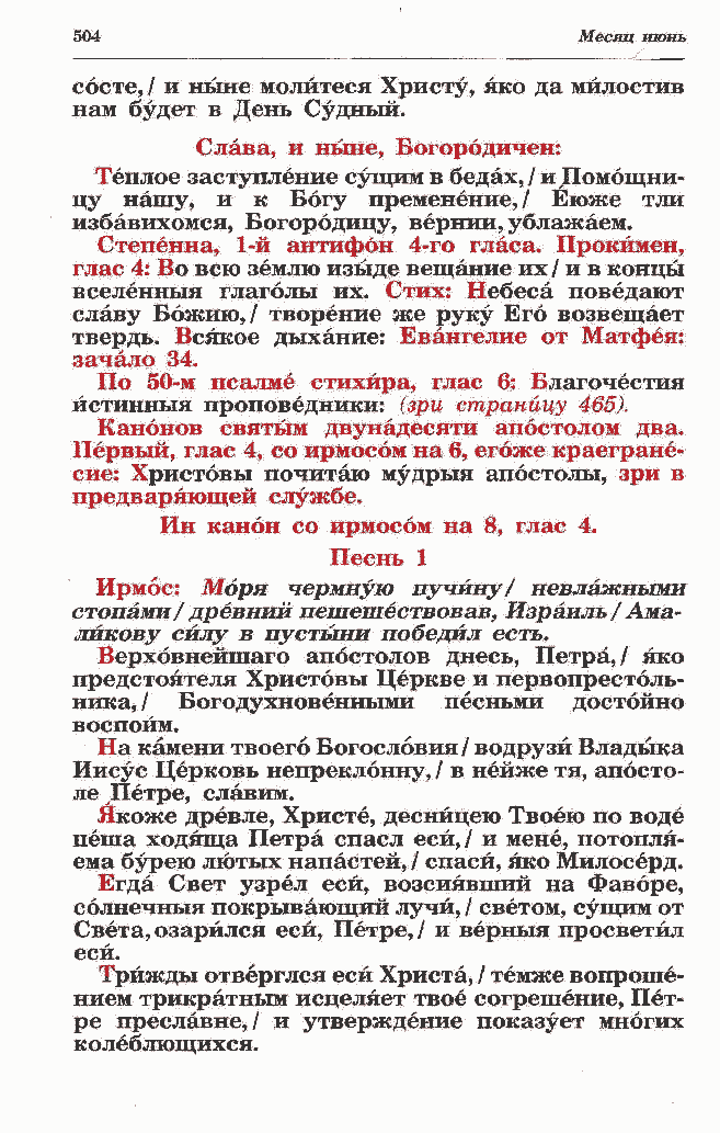 стопами/ древний лешешествовав, Израиль/ Ама- лйкову силу в пустыни победил есть. Верхбвнейшаго апостолов днесь, Петра,/ яко