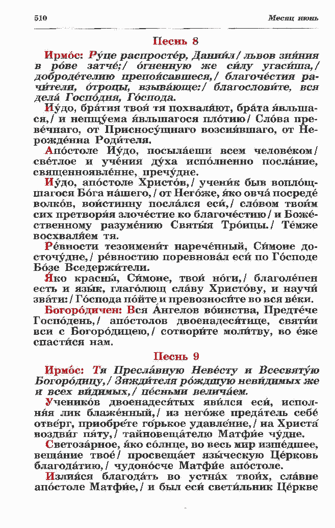 Господень,/ апостолов двоенадесятице, святйи вси с Богородицею,/ сотворите молитву, во еже спастйся нам. Песнь 9