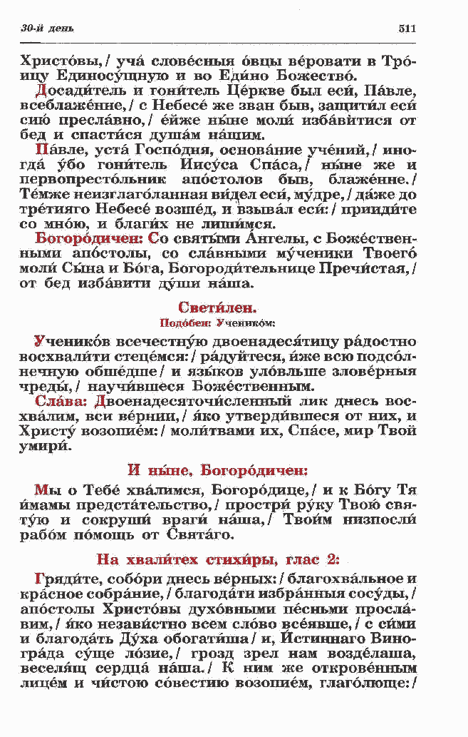 гда убо гонитель Иисуса Спаса,/ ныне же и первопрестольник апостолов быв, блаженне./ Темже неизглагбланная видел еси, мудре, / даже до третияго Небесе возшед, и взывал еси: / приидйте со мною, и благих не лишимся. Богородичен: Со святыми Ангелы, с Божествен-