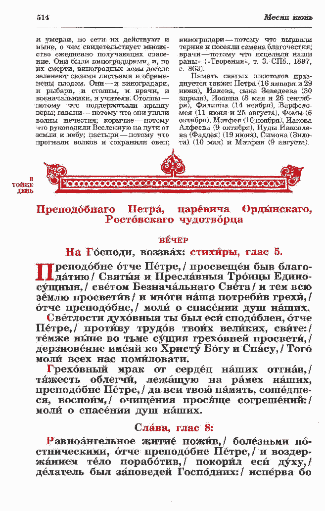 тяжесть облегчи, лежащую на рамех наших, преподобие Петре, / да вси твою память, сошедше- ся, воспойм,/ очищения просяще согрешений: / моли о спасении душ наших. Слава, глас 8: