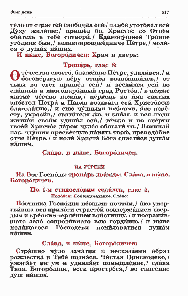 Духу жилище:/ пришед бо, Христос со Отцем обитель в тебе сотвори./ Единосущней Троице угодник быв, / великопроповедниче Петре, / молй- ся о душах наших. И ныне, Богородичен: Храм и дверь: