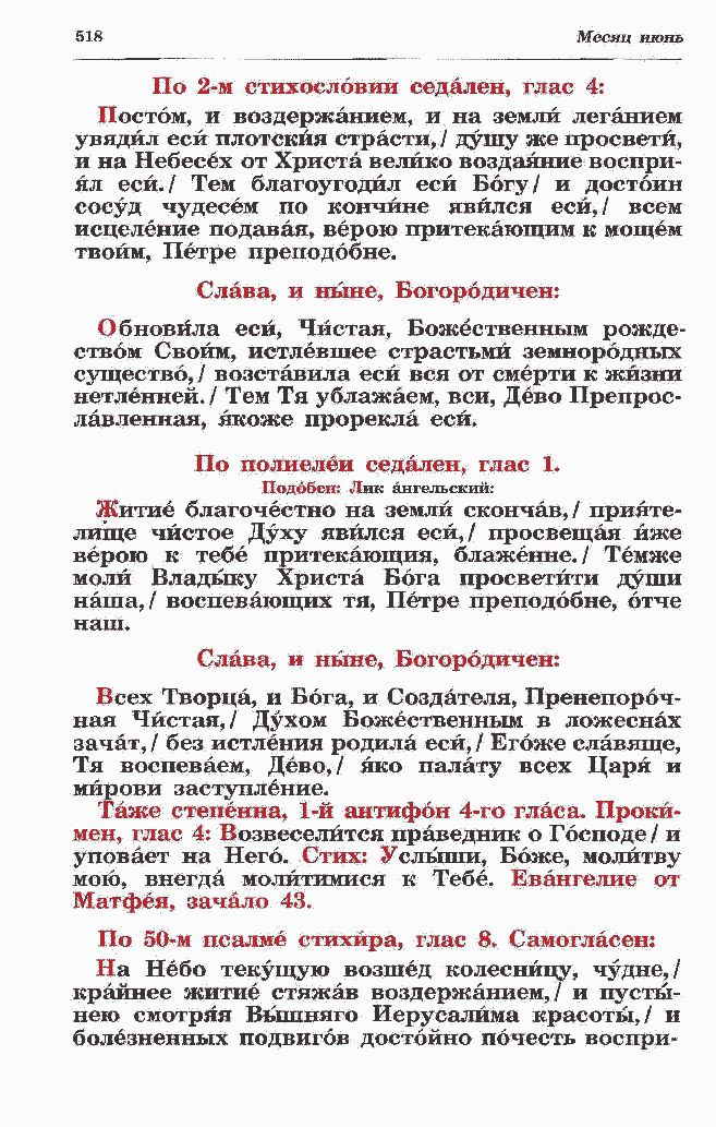 увядйл еси плотскйя страсти, / душу же просвети, и на Небесех от Христа велико воздаяние воспри- ял еси./ Тем благоугодйл еси Богу/ и достоин сосуд чудесем по кончине явился еси,/ всем исцеление подавая, верою притекающим к мощем твоим, Петре преподобие. Слава, и ныне, Богородичен: