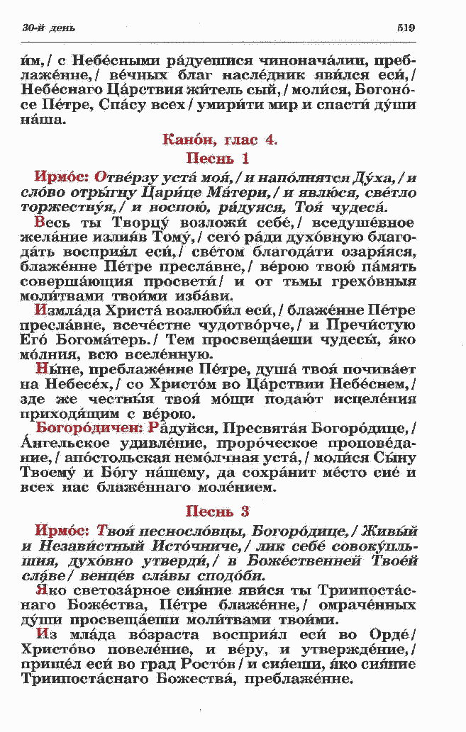 лаженне,/ вечных благ наследник явился еси,/ Небеснаго Царствия житель сый, / молйся, Богоно- се Петре, Спасу всех / умирйти мир и спасти души наша. Канон, глас 4.