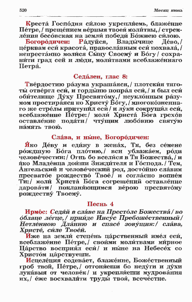 ты отвергл еси, и гордыню попрал еси, / и был еси обйтелище Духу Пресвятому,/ неуклонным разу- мом простирался ко Христу Богу, / многокозненна- го же стрелы притупил еси / и луки сокрушил еси, всеблаженне Петре:/ моли Христа Бога грехов оставление подати/ чтущим люббвию святую память твою. Слава, и ныне, Богородичен: