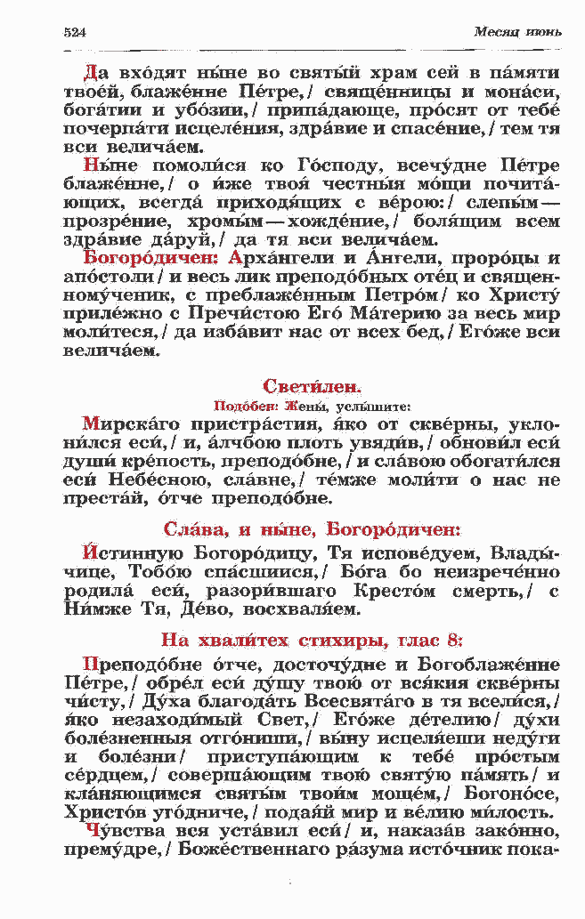 Петре,/ обрел еси душу твою от веякия скверны чйсту,/ Духа благодать Всесвятаго в тя вселися,/ яко незаходймый Свет,/ Егоже детелию/ духи болезненныя отгониши,/ выну исцеляенш недуги и болезни/ приступающим к тебе простым сердцем,/ совершающим твою святую память/ и кланяющимся святым твоим мощем,/ Богоносе, Христов угодниче, / подаяй мир и велию милость. Чувства вся уставил еси/ и, наказав законно,