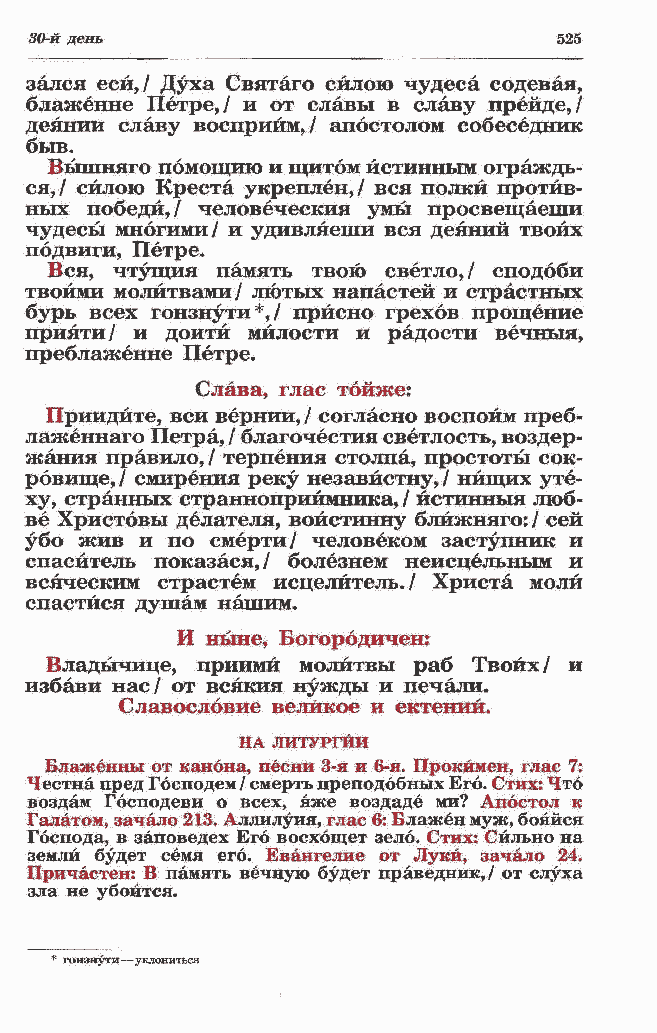 лаженнаго Петра, / благочестия светлость, воздер- жания правило,/ терпения столпа, простоты сок- ровище,/ смирения реку незавйстну, / нищих уте- ху, странных странноприймника, / йстинныя люб- ве Христовы делателя, войстинну блйжняго:/ сей убо жив и по смерти/ человеком заступник и спаситель показася,/ болезнем неисцельным и всяческим страстем исцелитель./ Христа моли спастйся душам нашим. И ныне, Богородичен: