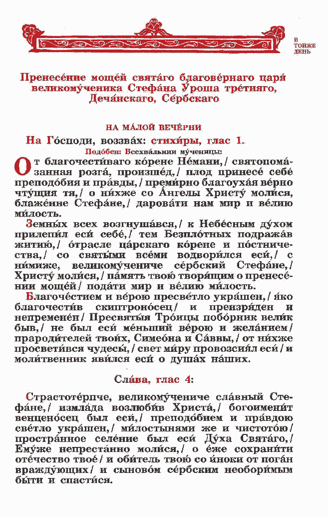 прилепил еси себе,/ тем Безплотных подражав житию,/ отрасле царскаго корене и постниче- ства,/ со святыми всеми водворился еси,/ с нймиже, великомучениче сербский Стефане,/ Христу молйся, / память твою творящим о пренесе- нии мощей/ подати мир и велию милость. Благочестием и верою пресветло украшен, / яко