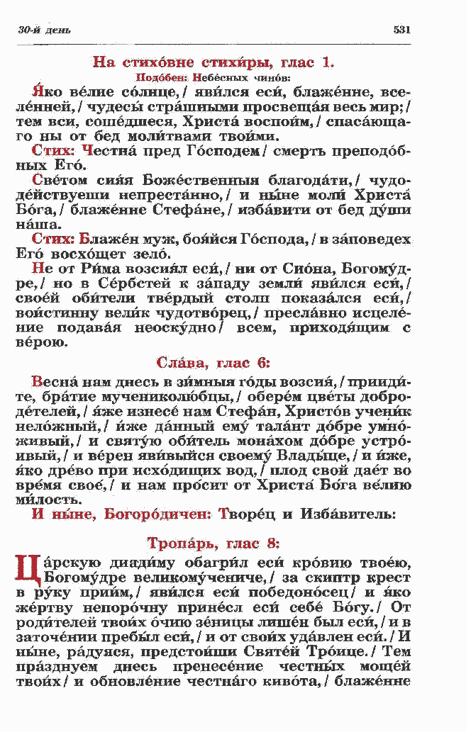 действуеши непрестанно,/ и ныне моли Христа Бога, / блаженне Стефане, / избавити от бед души наша. Стих: Блажен муж, бояйся Господа, / в заповедех