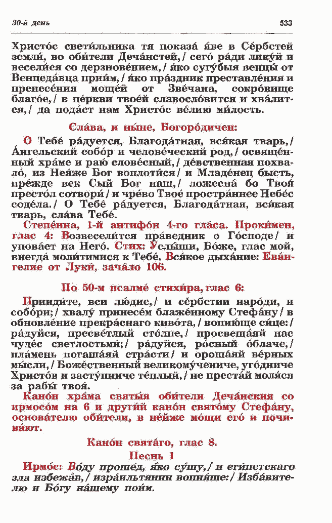 собори; / хвалу принесем блаженному Стефану / в обновление прекраснаго кивота, / вопиюще сйце: / радуйся, пресветлый столпе,/ просвещали нас чудес светлостьмй;/ радуйся, росный бблаче,/ пламень погашали страсти/ и орошаяй верных мысли, / Божественный великомучениче, угодниче Христов и заступниче теплый, / не престай моляся за рабы твоя. Канон храма святыя обители Дечанския со
