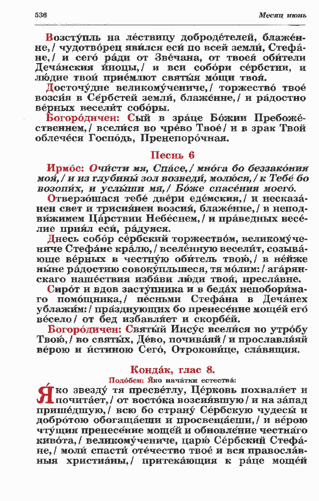не, / чудотворец явился еси по всей земли, Стефа- не,/ и сего ради от Звечана, от твоей обители Дечанския йноцы,/ и вси собори сербстии, и людие твой приемлют святыя мощи твоя. Досточудне великомучениче,/ торжество твое