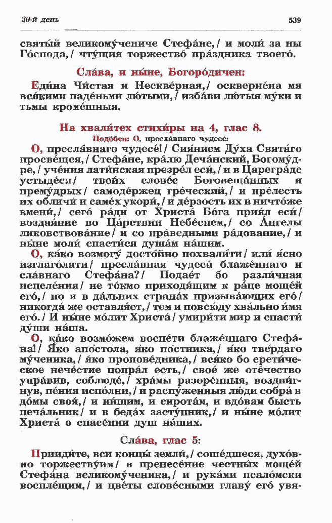 изглаголати/ преславная чудеса блаженнаго и славнаго Стефана?/ Подает бо различная исцеления/ не токмо приходящим к раце мощей его,/ но и в дальних странах призывающих его/ никогда же оставляет, / тем и повсюду хвально имя его. / И ныне молит Христа / умирйти мир и спасти души наша. О, како возможем воспети блаженнаго Стефа-