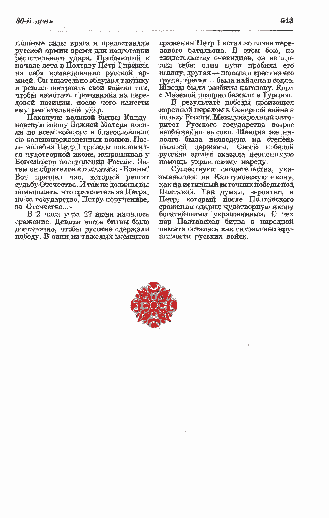 новскую икону Божией Матери носи- ли по всем войскам и благословляли ею коленопреклоненных воинов. Пос- ле молебна Петр I трижды поклонил- ся чудотворной иконе, испрашивая у Богоматери заступления России. За- тем он обратился к солдатам: «Воины! Вот пришел час, который решит судьбу Отечества. И так не должны вы помышлять, что сражаетесь за Петра, но за государство, Петру порученное, за Отечество...» В 2 часа утра 27 июня началось