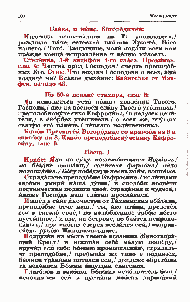 Да исполнятся уста наша/ хваления Твоего, Господи, / яко да воспоем славу Твоего угодника, / препод обномученика Евфросйна, / в недузех цели- теля,/ в скорбех утешителя,/ о всех же, чтущих святую его память,/ теплаго молитвенника. Канон Пресвятей Богородице со ирмосом на 6 и