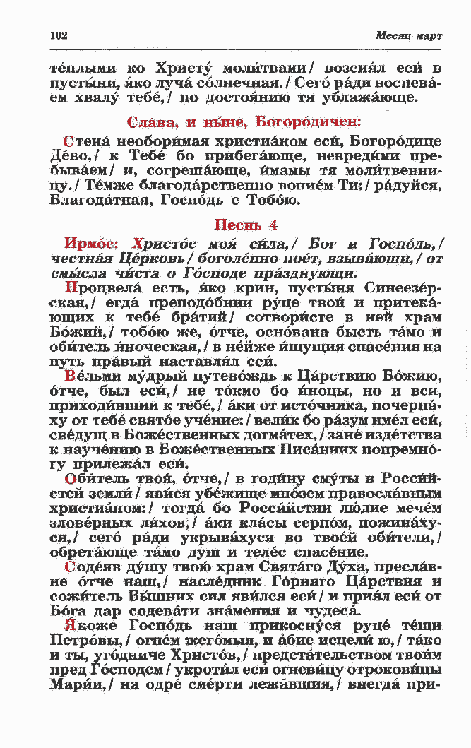 стей земли / явйся убежище мнозем православным христианом:/ тогда бо Россййстии людие мечем зловерных ляхов;/ аки класы серпом, пожинаху- ся,/ сего ради укрывахуся во твоей обители,/ обретающе тамо душ и телес спасение. Содеяв душу твою храм Святаго Духа, преслав-