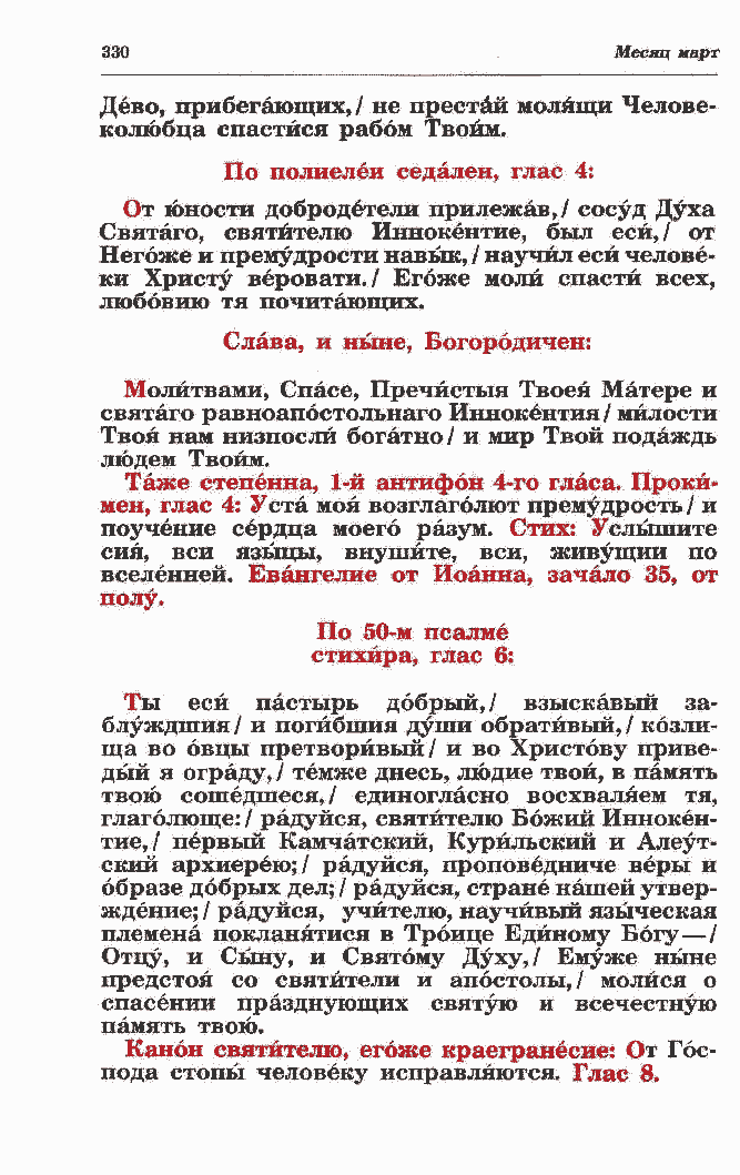 блуждшия / и погйбшия души обратйвый, / козли- ща во овцы претворйвый / и во Христову приве- дый я ограду,/ темже днесь, людие твой, в память твою сошедшеся,/ единогласно восхваляем тя, глаголюще: / радуйся, святителю Божий Иннокен- тие,/ первый Камчатский, Курильский и Алеут- ский архиерею;/ радуйся, проповедниче веры и образе добрых дел; / радуйся, стране нашей утвер- ждение; / радуйся, учителю, научивый языческая племена покланятися в Троице Единому Богу?/ Отцу, и Сыну, и Святому Духу,/ Емуже ныне предстоя со святители и апостолы,/ молйся о спасении празднующих святую и всечестную память твою. Канон святителю, егоже краегранесие: От Гос-