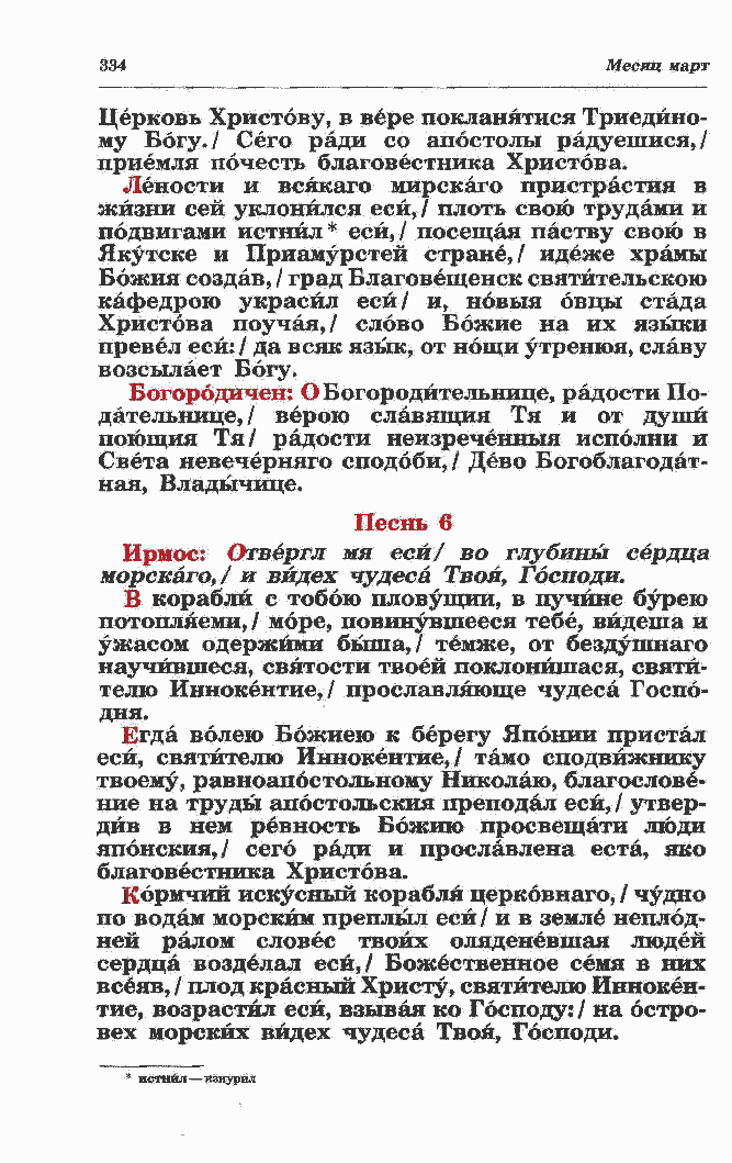 жизни сей уклонился еси, / плоть свою трудами и подвигами истнил* еси,/ посещая паству свою в Якутске и Приамурстей стране,/ идеже храмы Божия создав, / град Благовещенск святительскою кафедрою украсил еси/ и, нбвыя овцы стада Христова поучая,/ слово Ббжие на их языки превел еси: / да всяк язык, от нощи утренюя, славу возсылает Богу. Богорбдичен: ОБогородйтельнице, радости По-