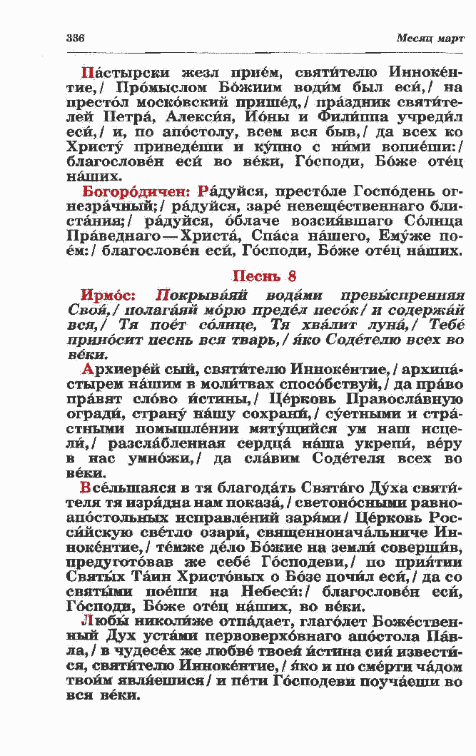 теля тя изрядна нам показа, / светоносными равно- апостольных исправлений зарями/ Церковь Рос- сийскую светло озари, священноначальниче Ин- нокентие, / темже дело Божие на земли совершив, предуготовав же себе Господеви,/ по приятии Святых Тайн Христовых о Бозе почил еси, / да со святыми поеши на Небесй:/ благословен еси, Господи, Боже отец наших, во веки. Любы николйже отпадает, глаголет Божествен-