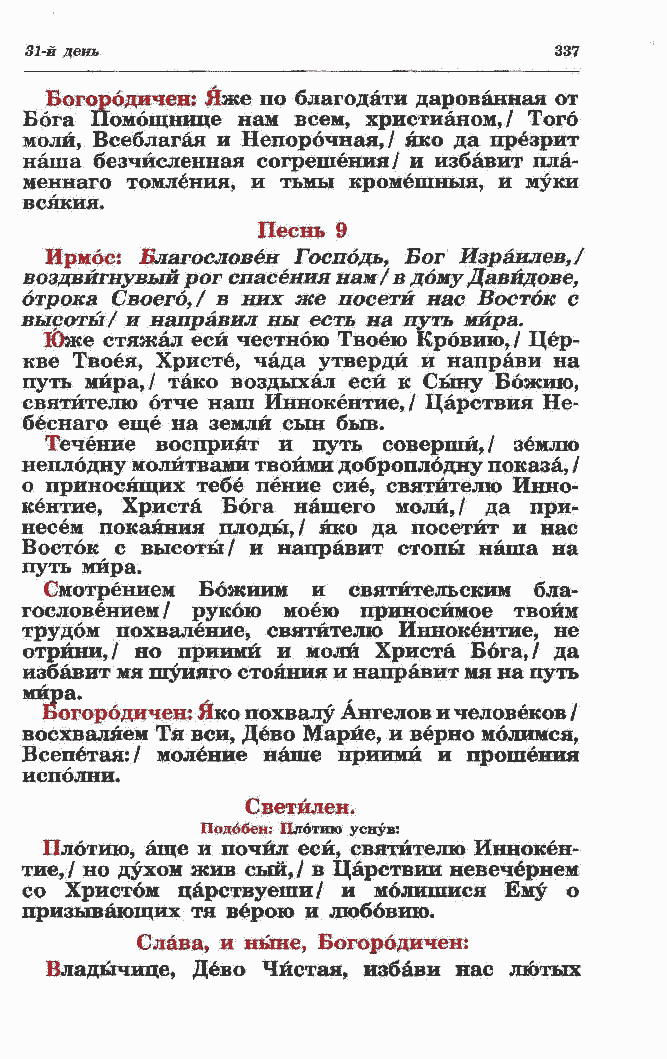 неплодну молитвами твоими доброплодну показа, / о приносящих тебе пение сие, святителю Инно- кентие, Христа Бога нашего моли,/ да при- несем покаяния плоды,/ яко да посетит и нас Восток с высоты/ и направит стопы наша на путь мира. Смотрением Божиим и святительским бла-