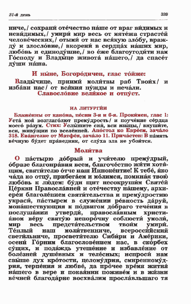 образе благонравия всем, благочестно жйти хотя- щим, святителю отче наш Иннокентие! К тебе, яко чада ко отцу, прибегаем и молимся, поминая твою любовь к людем: буди щит несокрушим Святей Церкви Православной и отечеству нашему, архи- ереи благолепием святительства и премудростию украсй, пастырем в служении ревность даруй, монашествующий к подвигом добраго течения в послушании утверди, православным Христи- аном веру святую непорочну соблюсти умоли, мир весь предстательством твоим умири. Теплый наш молйтвенниче, всероссийский светйльниче, просветителю Сибири и Америки, осени Горним благословением нас, в скорбех сущих, и подаждь утешение и избавление от болезней душевных и телесных; испроси нам свыше дух кротости, целомудрия, смиренномуд- рия, терпения и любве, да прочее время жития нашего в вере и покаянии поживем и в жизни вечней благодарив восхвалим прославлыпаго тя |