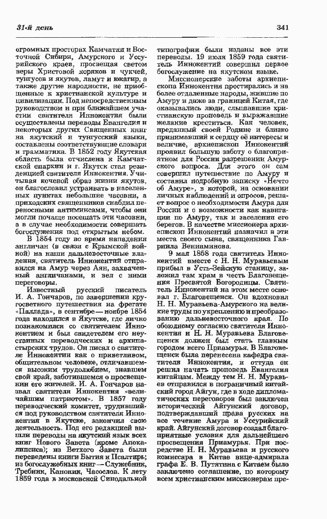И. А. Гончаров, по завершении кру- госветного путешествия на фрегате «Паллада», в сентябре?ноябре 1854 года находился в Якутске, где лично познакомился со святителем Инно- кентием и был свидетелем его неу- станных переводческих и архипа- стырских трудов. Он писал о святите- ле Иннокентии как о приветливом, общительном человеке, отличавшем- ся высоким трудолюбием, знавшем свой край, заботившемся о просвеще- нии его жителей. И. А. Гончаров на- звал святителя Иннокентия «вели- чайшим патриотом». В 1857 году переводческий комитет, трудивший- ся под руководством святителя Инно- кентия в Якутске, закончил свою деятельность. Под его редакцией вы- шли переводы на якутский язык всех книг Нового Завета (кроме Апока- липсиса); из Ветхого Завета были переведены книги Бытия и Псалтирь; из богослужебных книг?Служебник, Требник, Каноник, Часослов. К лету 1859 года в московской Синодальной |