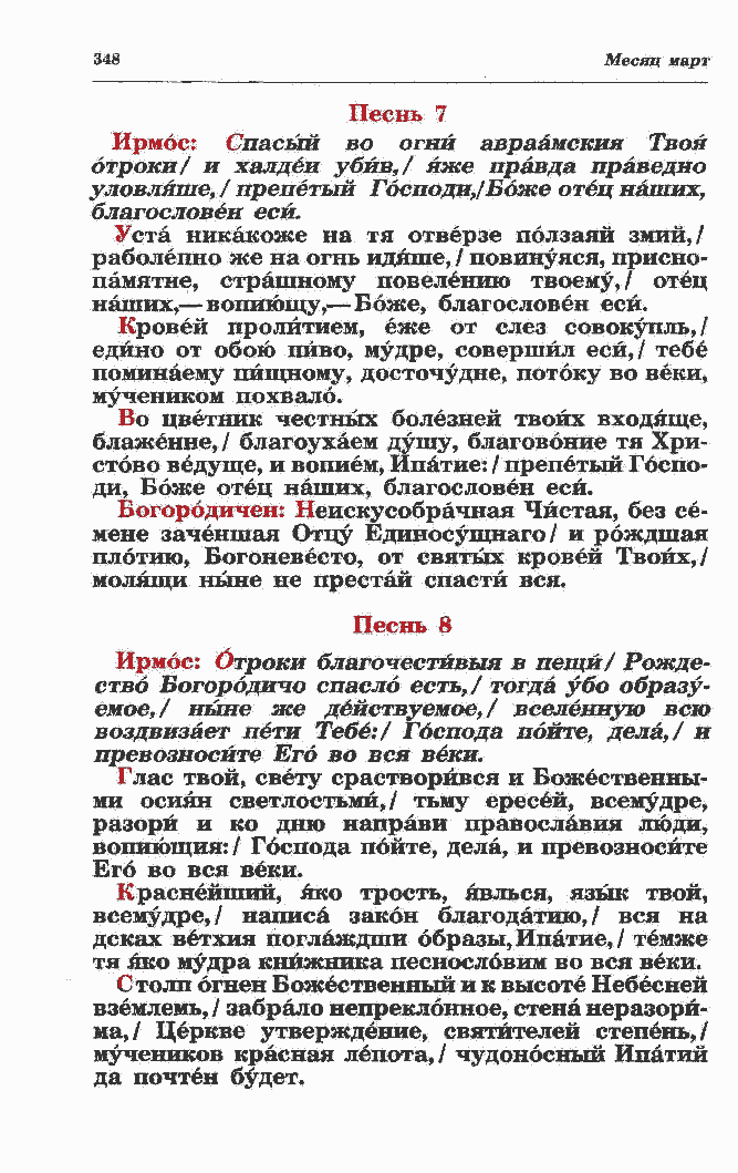раболепно же на огнь идяше, / повинуяся, присно- памятне, страшному повелению твоему,/ отец наших,? вопиющу,? Боже, благословен еси. Кровей пролитием, еже от слез совокупль,/