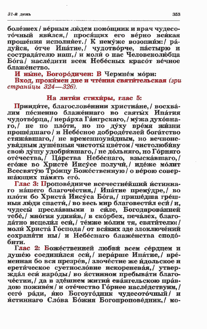 душею соединился еси,/ иерарше Ипатие,/ вре- менная бо вся презрев, / злочестие же идольское и еретическое суетнословие искореневая, / утвер- ждал еси народы/ во истинном пребывати благо- честии, / да в здешнем житий евангельскою прав- дою поживем / и отечество Горнее наследствуим, / сего ради, яко Богоугодник чудесоточный / и йстиннаго Слова Божия Богопроповедник, / мо- |