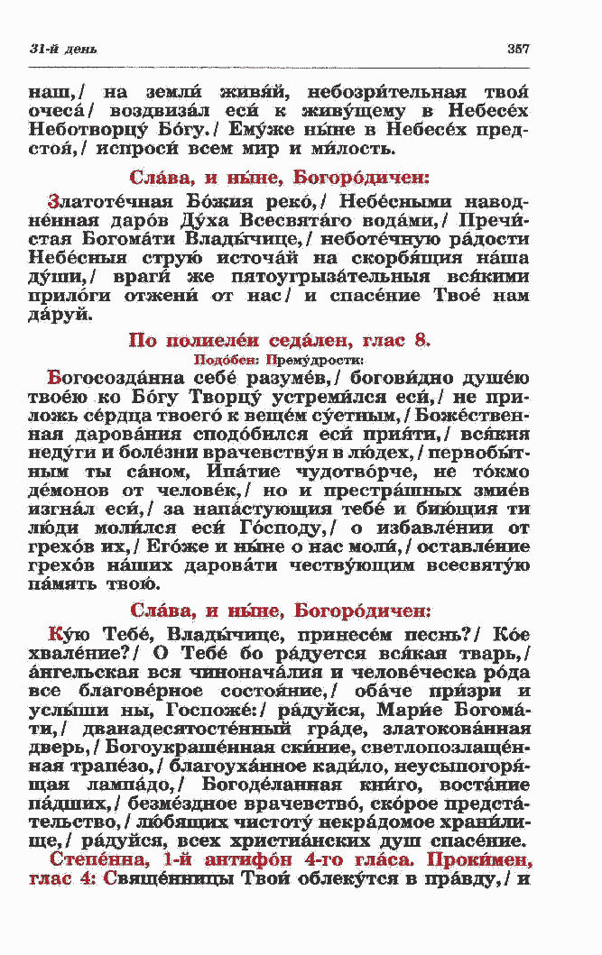 ненная даров Духа Всесвятаго водами,/ Пречи- стая Богомати Владычице,/ неботечную радости Небесный струю источай на скорбящий наша души,/ враги же пятоугрызательныя всякими прилоги отженй от нас/ и спасение Твое нам даруй. По полиелеи седален, глас 8.