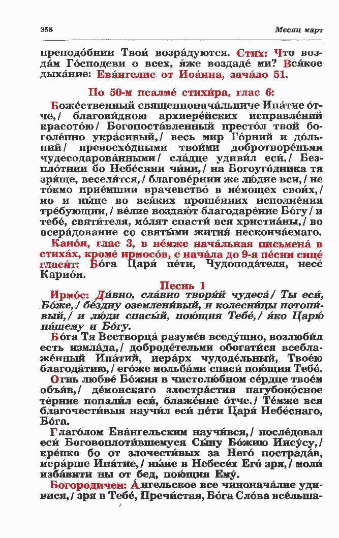 еси Боговоплотйвшемуся Сыну Божию Иисусу,/ крепко бо от злочестйвых за Него пострадав, иерарше Ипатие,/ ныне в Небесех Его зря,/ моли избавити ны от бед, поющия Ему. Богородичен: Ангельское все чиноначалие уди-
