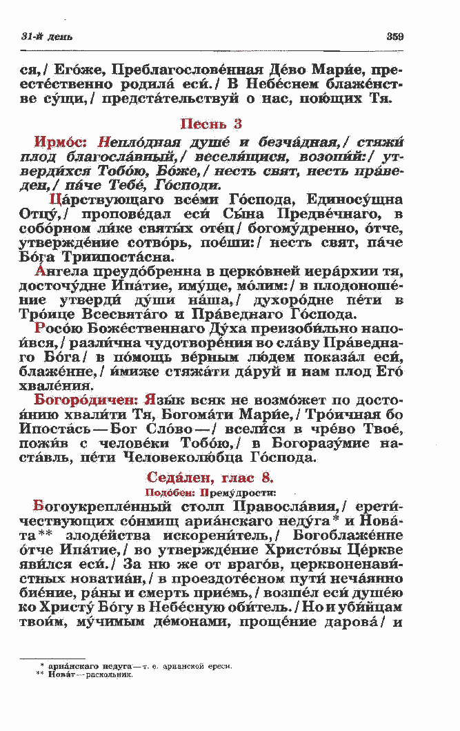 чествующих сонмищ арианскаго недуга* и Нова- та** злодейства искоренитель,/ Богоблаженне отче Ипатие,/ во утверждение Христовы Церкве явился еси./ За ню же от врагов, церквоненавй- стных новатиан, / в проездотесном пути нечаянно биение, раны и смерть приемь, / возшел еси душею ко Христу Богу в Небесную обитель. / Но и убийцам твоим, мучимым демонами, прощение дарова/ и |