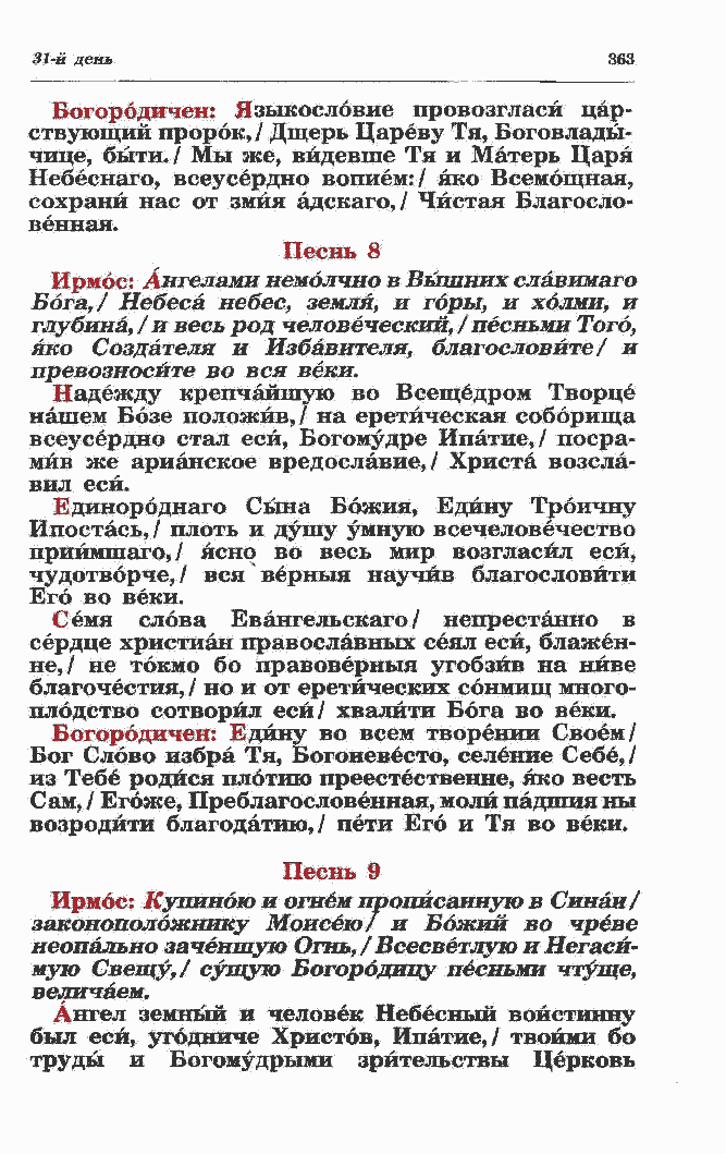 ствующий пророк, / Дщерь Цареву Тя, Боговлады- чице, быти./ Мы же, вйдевше Тя и Матерь Царя Небеснаго, всеусердно вопием:/ яко Веемощная, сохрани нас от змия адскаго,/ Чистая Благосло- венная. Песнь 8