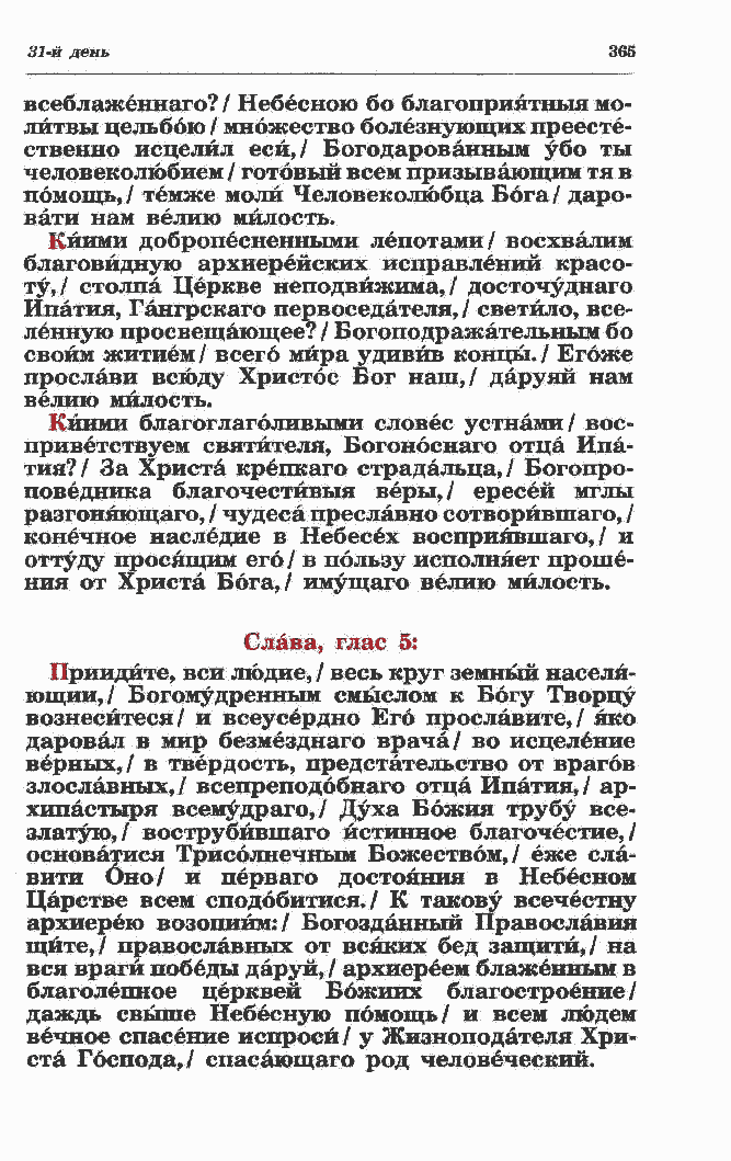 ющий,/ Богомудренным смыслом к Богу Творцу вознесйтеся/ и всеусердно Его прославите,/ яко даровал в мир безмезднаго врача/ во исцеление верных,/ в твердость, предстательство от врагов злославных,/ всепреподобнаго отца Ипатия,/ ар- хипастыря всемудраго,/ Духа Божия трубу все- златую,/ вострубйвшаго истинное благочестие,/ основатися Трисолнечным Божеством,/ еже сла- вити Оно/ и перваго достояния в Небесном Царстве всем сподобитися./ К такову всечестну архиерею возопийм:/ Богозданный Православия щите,/ православных от всяких бед защити,/ на вся враги победы даруй, / архиереем блаженным в благолепное церквей Божиих благостроение/ даждь свыше Небесную помощь/ и всем людем вечное спасение испроси/ у Жизноподателя Хри- ста Господа,/ спасающего род человеческий. |