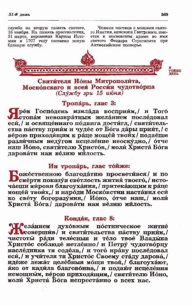 смерти показу я светлость жития твоего, / исто- чаеши мйрови благоухания, / притекающим к раце мощей твоих, / и народи Московстии наставил еси ко свету богоразумия,/ Ионо, отче наш,/ моли Христа Бога/ даровати нам велию милость. Кондак, глас 8: