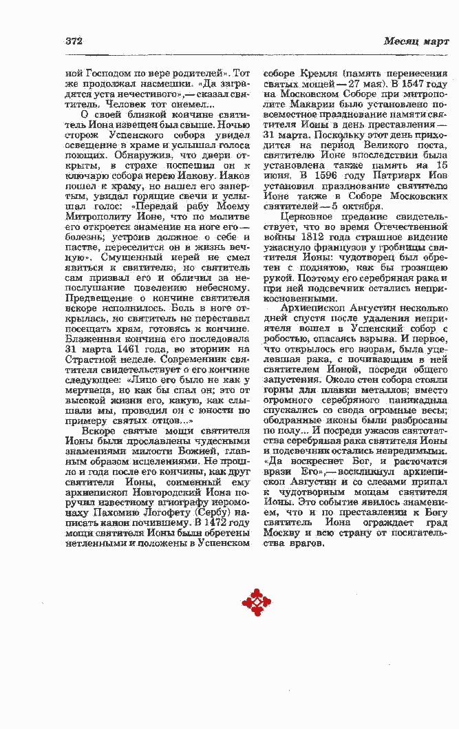 тель Иона извещен был свыше. Ночью сторож Успенского собора увидел освещение в храме и услышал голоса поющих. Обнаружив, что двери от- крыты, в страхе поспешил он к ключарю собора иерею Иакову. Иаков пошел к храму, но нашел его запер- тым, увидал горящие свечи и услы- шал голос: «Передай рабу Моему Митрополиту Ионе, что по молитве его откроется знамение на ноге его? болезнь; устроив должное о себе и пастве, переселится он в жизнь веч- ную». Смущенный иерей не смел явиться к святителю, но святитель сам призвал его и обличил за не- послушание повелению небесному. Предвещение о кончине святителя вскоре исполнилось. Боль в ноге от- крылась, но святитель не переставал посещать храм, готовясь к кончине. Блаженная кончина его последовала 31 марта 1461 года, во вторник на Страстной неделе. Современник свя- тителя свидетельствует о его кончине следующее: «Лицо его было не как у мертвеца, но как бы спал он; это от высокой жизни его, какую, как слы- шали мы, проводил он с юности по примеру святых отцов...» Вскоре святые мощи святителя